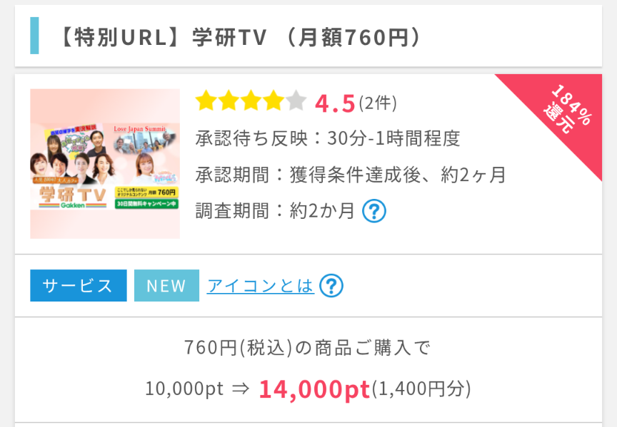 | 獲得ポイント | 14,000ポイント(1,400円相当) |