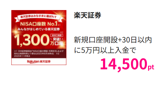 | 達成条件 | 総合取引口座開設完了後、30日以内に楽天証券口座へ5万円以上の入金完了 |
