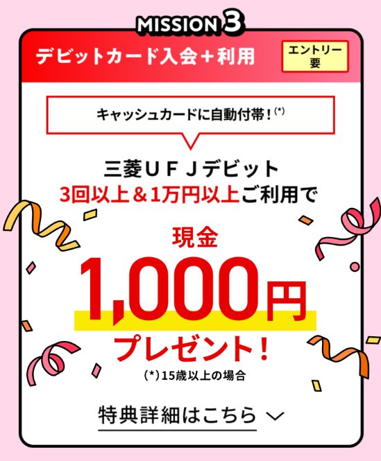 三菱UFJ銀行では口座紹介プランと同時に、「三菱UFJカード新規入会&条件達成で10,000円相当」、「三菱UFJデビット3回以上&1万円以上利用で現金1,000円」がもらえるキャンペーンを開催中。