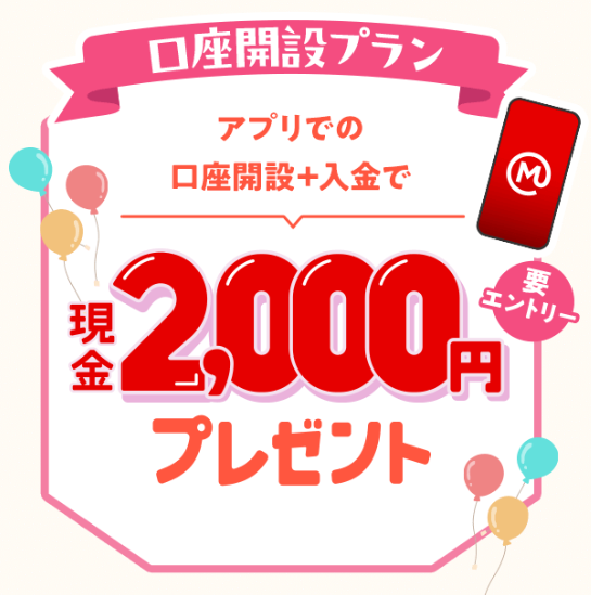 さらにアプリでの口座開設+1万円以上の入金で2,000円がもらえる「口座開設プラン」も同時開催中です。