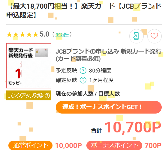 | 達成条件 | モッピー公式YouTubeチャンネル『モッピーチャンネル』チャンネル登録 |