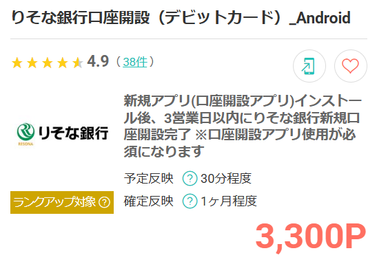 | 達成条件 | 新規アプリ(口座開設アプリ)インストール後、3営業日以内にりそな銀行新規口座開設完了 |