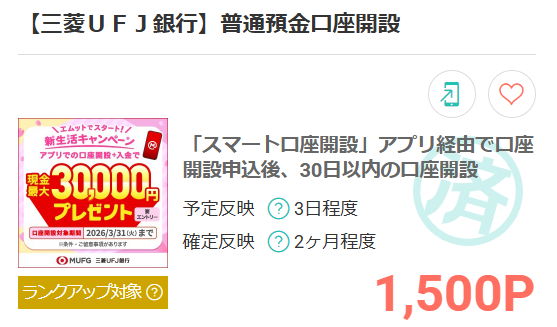 - 三菱UFJ銀行口座開設で最大38,000円(3/31まで)