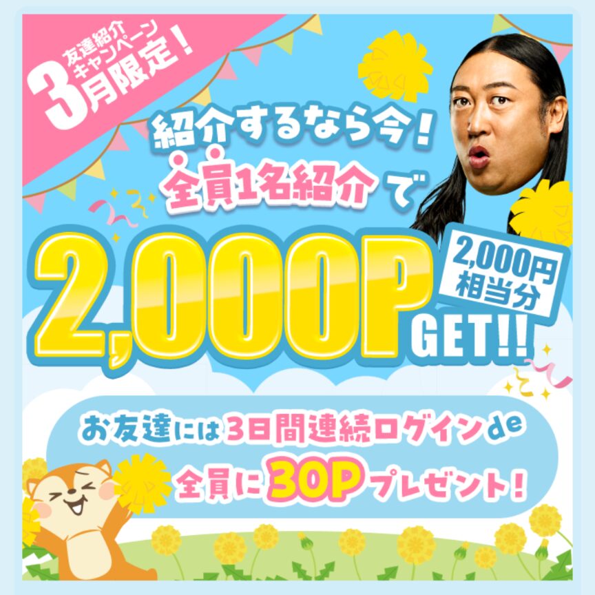 1名紹介するだけで2,000ポイントがもらえるキャンペーンとなっています。